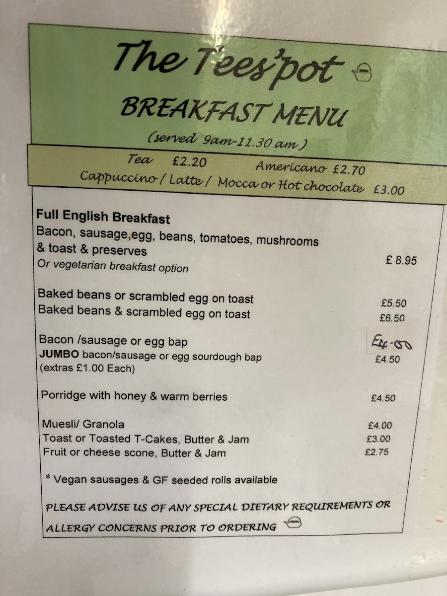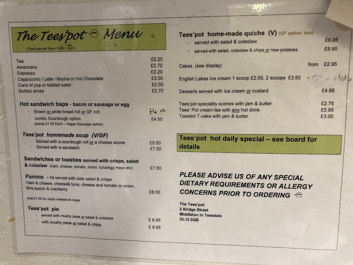 In a region dotted with tourist-friendly cafés, The Tees’pot sets itself apart with a strong emphasis on homemade quality and local character. Whether you're a hiker, a cyclist, or a family exploring the North Pennines, it’s the kind of place you’ll want to return to. The Tees’pot Menu reflects exactly what a village café should be-unpretentious, delicious, and comforting. Highly recommended for anyone passing through Barnard Castle and the surrounding area.